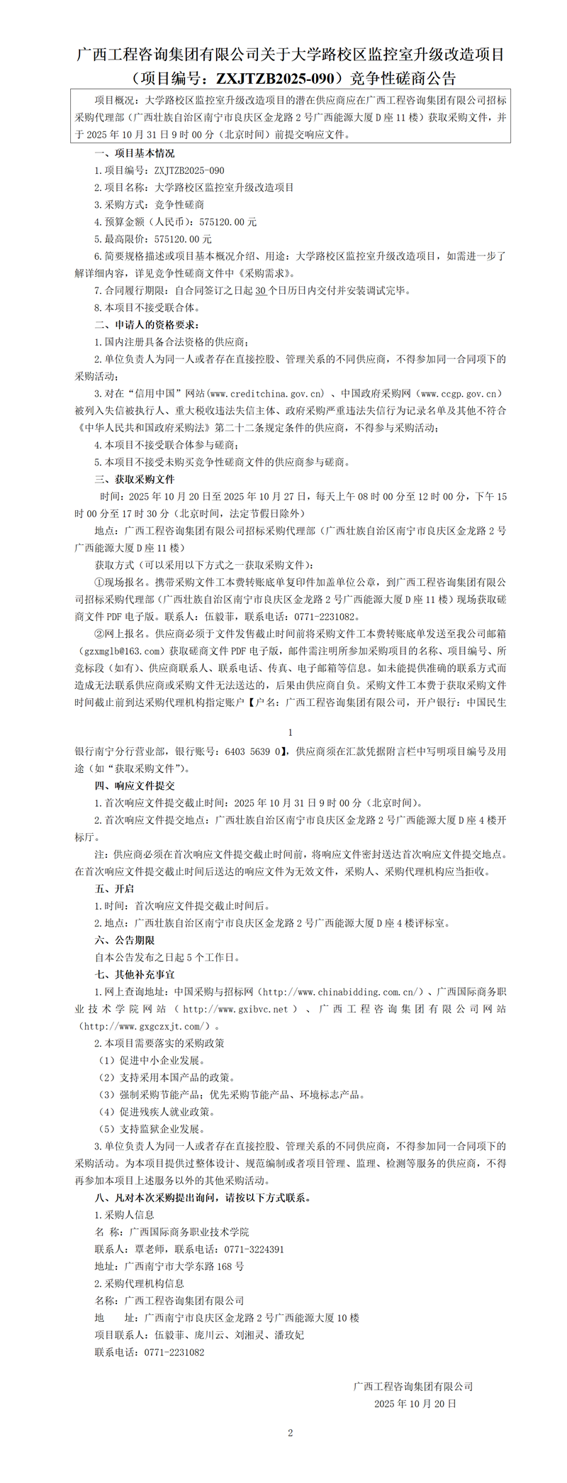 廣西工程咨詢集團有限公司關(guān)于大學(xué)路校區(qū)監(jiān)控室升級改造項目(項目編號:ZXJTZB2025-090)競爭性磋商公告