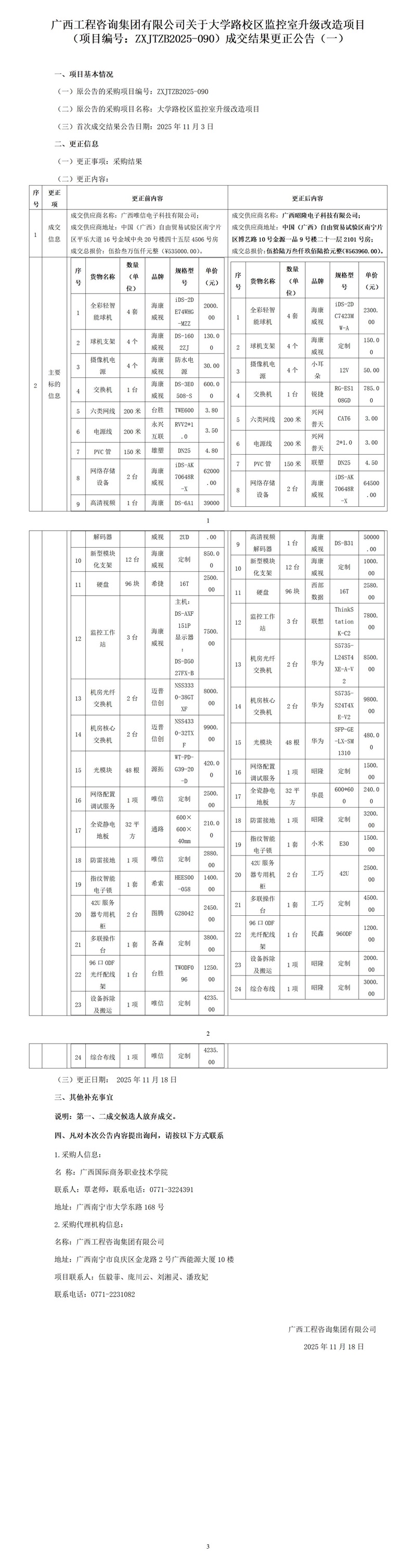 廣西工程咨詢集團(tuán)有限公司關(guān)于大學(xué)路校區(qū)監(jiān)控室升級(jí)改造項(xiàng)目 (項(xiàng)目編號(hào):ZXJTZB2025-090)成交結(jié)果更正公告(一)