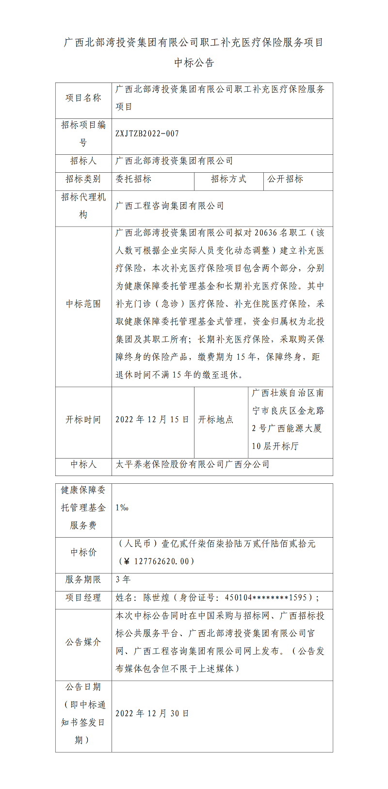 廣西北部灣投資集團有限公司職工補充醫(yī)療保險服務項目中標公告