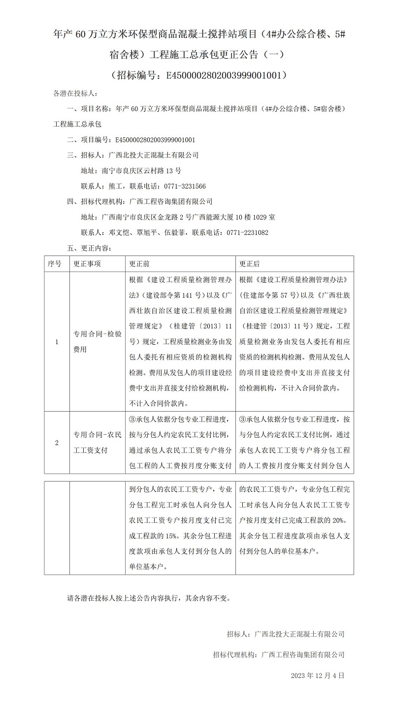年產(chǎn)60萬(wàn)立方米環(huán)保型商品混凝土攪拌站項(xiàng)目(4#辦公綜合樓、5#宿舍樓)工程施工總承包更正公告(一) (招標(biāo)編號(hào):E4500002802003999001001