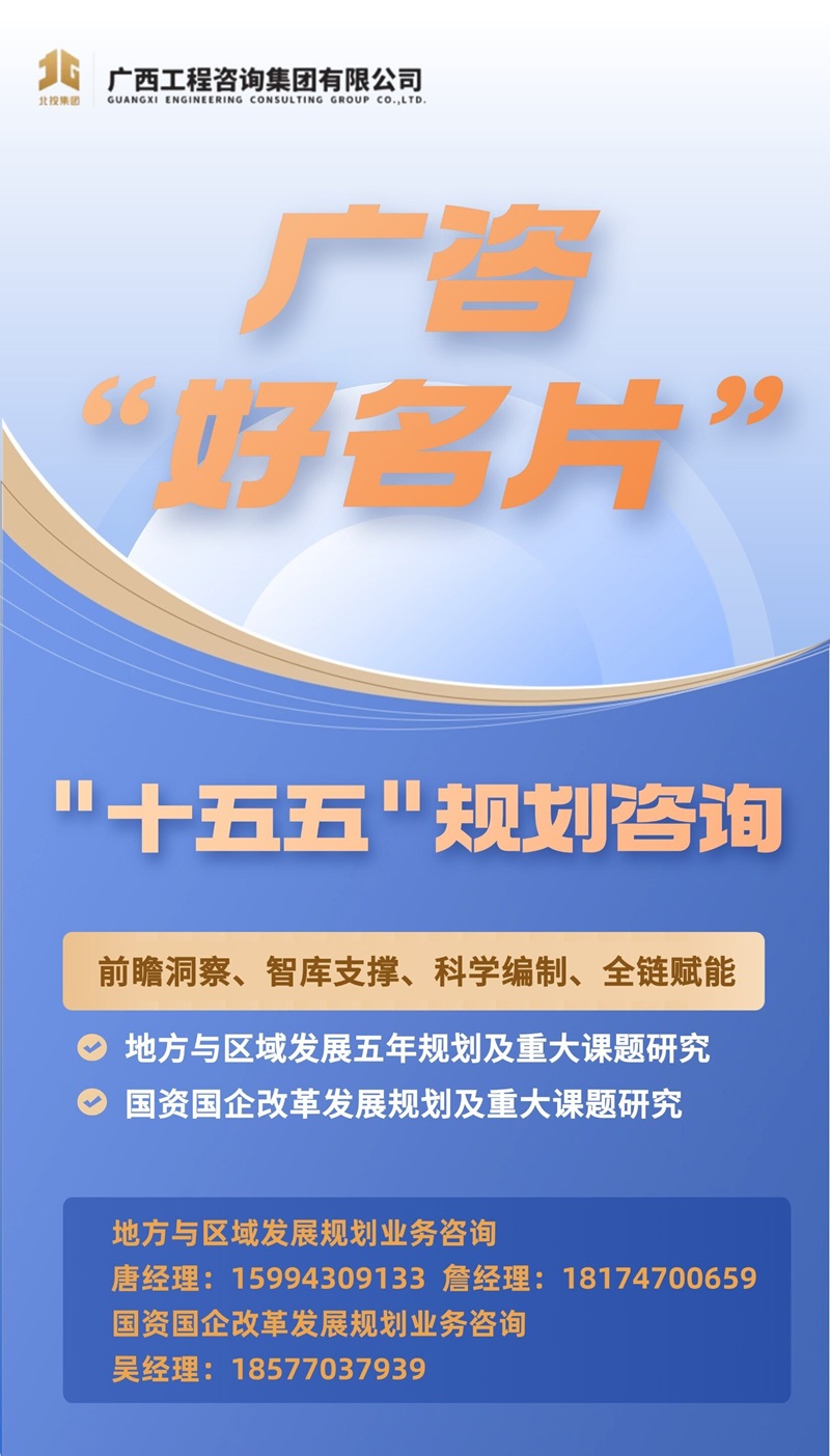 經(jīng)歷37年的發(fā)展,廣咨集團(tuán)擁有200+專業(yè)咨詢師、3000+行業(yè)專家、200+資深專家,依托中國工程咨詢協(xié)會及發(fā)展規(guī)劃專業(yè)委員會、廣西工程咨詢協(xié)會、廣西國資國企改革發(fā)展研究會、廣西國資國企智庫聯(lián)盟理事長單位、廣西對外經(jīng)濟(jì)合作保障服務(wù)中心等智庫平臺,立足各領(lǐng)域前沿,聯(lián)合發(fā)揮各專業(yè)所長,為“十五五”規(guī)劃編制工作提供智力支撐。